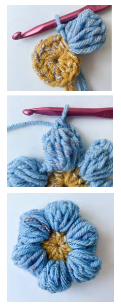 2ª vuelta: Con Color 1, hacer 3 cadenas (cuenta como punto alto). (Envolver el hilo alrededor del gancho y pasar a través de un largo bucle, igual en altura a las primeras 3 cadenas. Envolver el hilo alrededor del gancho y pasar a través de 2 bucles en el gancho) 6 veces, todo en el mismo punto alto que el punto deslizado. Envolver el hilo alrededor del gancho y pasar a través de 6 bucles en el gancho. Envolver el hilo alrededor del gancho y pasar a través de los últimos 2 bucles. Hacer 3 cadenas. Punto deslizado en el mismo punto alto - primera Pétalo hecho. *1 punto bajo en el próximo punto alto. (Punto deslizado. Hacer 3 cadenas. Cluster. Hacer 3 cadenas. Punto deslizado) en el próximo punto alto - Cluster de Pétalos hecho. Repetir desde * 4 veces más. 1 punto bajo en el último punto alto. 6 pétalos en total.**