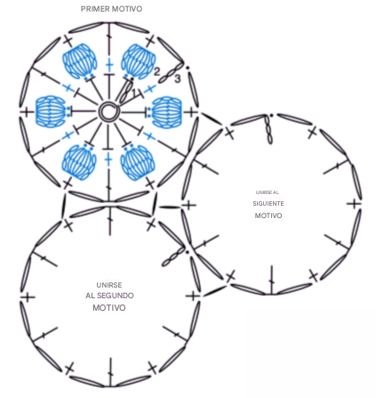 3ª vuelta: Hacer 4 cadenas (cuenta como punto alto. Hacer 1 cadena). 1 punto bajo en la parte superior del próximo Pétalo. Punto deslizado en un punto bajo en la parte superior del primer (derecho) Motivo adyacente antes de la unión existente. Hacer 1 cadena. 1 punto alto en el próximo punto bajo. Hacer 1 cadena. 1 punto bajo en la parte superior del próximo Pétalo. Punto deslizado en el mismo punto bajo que la unión existente. Hacer 1 cadena. 1 punto alto en el próximo punto bajo. Hacer 1 cadena. 1 punto bajo en la parte superior del próximo Pétalo. Punto deslizado en un punto bajo en la parte superior del segundo (izquierdo) Motivo después de la unión existente. *Hacer 1 cadena. 1 punto alto en el próximo punto bajo. Hacer 1 cadena. 1 punto bajo en la parte superior del próximo Pétalo. Repetir desde * dos veces más. Hacer 1 cadena. Unir con un punto deslizado en la 3ª cadena del inicio de las 4 cadenas. Rematar.