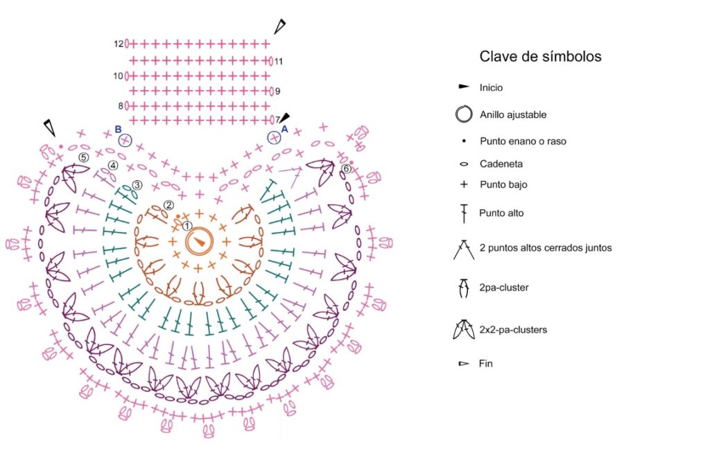 - Todas las vueltas están numeradas en el Gráfico del Collar y cada una de ellas comienza donde figura el respectivo número de vuelta. A su vez, la Tabla de Colores indica el color de hilo usado en cada vuelta.