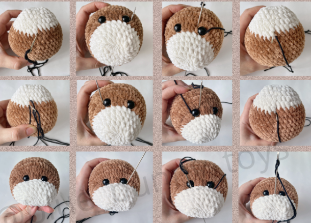 - Cose la nariz en la parte central del hocico, siguiendo las instrucciones de las imágenes.